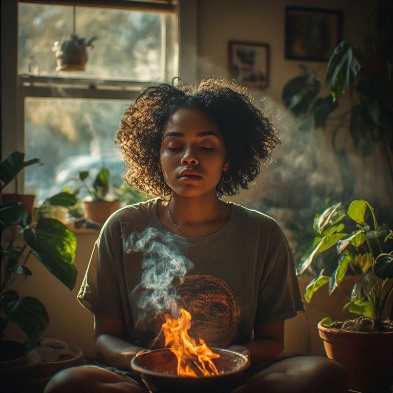 A stick of palo santo smolders. She intends the sacred whisps, lemony and licoricey pine, to exorcise the residual guilt (and taco-fart) energy from a Grubhub barrage that had spiraled into a rabbit hole of self-loathing hours dissolved in a same-old-same-old sativa frenzy. It began with shitposting on a manga subreddit.